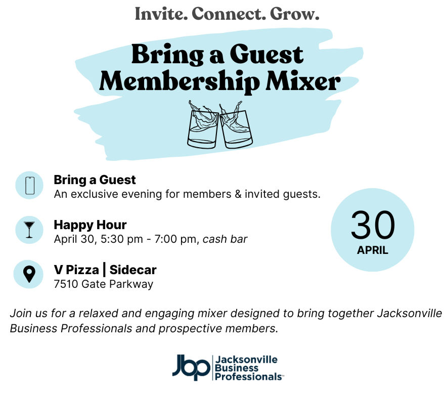 Make sure to attend the upcoming Bring a Guest Membership Mixer on April 30, 2026 at Sidecar | V Pizza on Gate at 5:30PM.